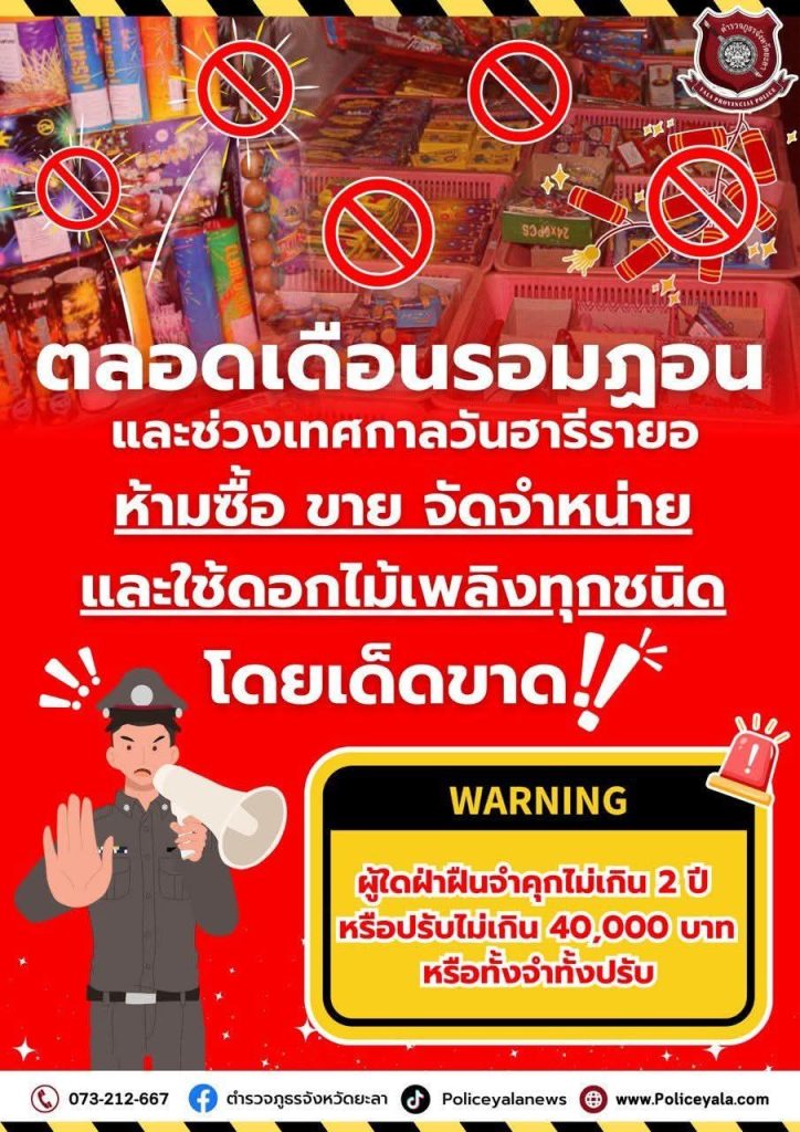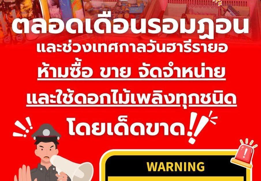 ตลอดเดือนรอมฎอน และ ช่วงเทศกาลฯ 14 มีนาคม 2568 โดย admin / ข่าวประชาสัมพันธ์ ตลอดเดือนรอมฎอน และ ช่วงเทศกาลฯ ห้าม ซื้อขาย จัดจำหน่าย และใช้ดอกไม้เพลิง ทุกชนิด โดยเด็ดขาด ผู้ใดฝ่าฝืนมีโทษทั้งจำและปรับ นะครับ#เพื่อความปลอดภัยและไม่เป็นการรบกวนชาวบ้านครับ#ด้วยความห่วงใย FacebookFacebookXXLINELine