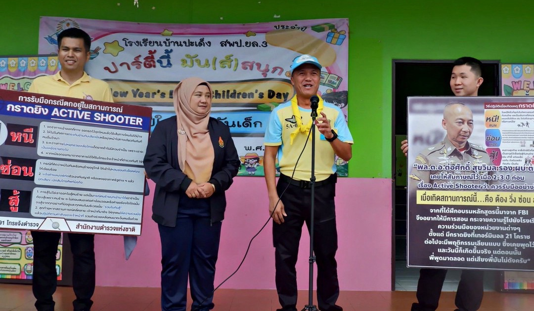 เมื่อวันที่ 24 ม.ค.68 เวลา 10.00 น.พ.ต.ท.ธัญ ศิริขันธ์ สวญ.สภ.แม่หวาด พร้อมด้วยข้าราชการตำรวจ สภ.แม่หวาด บรรยายให้ความรู้แก่นักเรียน คณะครูและบุคลากรในโรงเรียนบ้านปะเด็ง เรื่อง กลวิธี “หนี ซ่อน สู้” และได้มีการจำลองเหตุการณ์มีคนร้ายเข้ามาในสถานศึกษา เพื่อให้คณะครู บุคลากรและนักเรียนสามารถรับมือเอาชีวิตรอดจากเหตุการณ์กรณีที่มีคนร้ายเข้ามาในสถานศึกษาได้หากเกิดเหตุการณ์ดังกล่าว พร้อมทั้งมอบไอศกรีมให้กับเด็กนักเรียน ณ โรงเรียนบ้านปะเด็ง ม.4 บ้านปะเด็ง ต.แม่หวาด อ.ธารโต จ.ยะลา