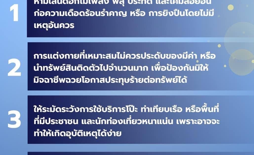 ป้องกันภัยจากเทศกาลลอยกระทง 14 พฤศจิกายน 2567 โดย admin / ข่าวประชาสัมพันธ์ ผู้บัญชาการตำรวจแห่งชาติ สั่งการตำรวจทั่วประเทศดูแลความปลอดภัยช่วงเทศกาลลอยกระทงอย่างเข้มงวด พร้อมขอความร่วมมือประชาชนป้องกันอันตราย โดยเฉพาะพื้นที่ที่มีนักท่องเที่ยวหนาแน่น #ลอยกระทง67 _____________________ ตำรวจภูธรจังหวัดยะลา FacebookFacebookXXLINELine
