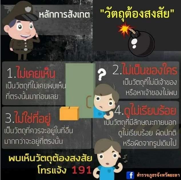 เมื่อเราพบว่ามีวัตถุต้องสงสัยอยู่ในพื้นที่ หรือ เกิดสถานการณ์ฉุกเฉินจากวัตถุดังกล่าว ก็ขอให้ผู้พบเห็นตั้งสติ และให้รีบโทรแจ้งเจ้าหน้าที่ที่เกี่ยวข้อง หรือโปรดโทรแจ้งไปยัง 191 ได้ทันที ตลอด 24 ชม.