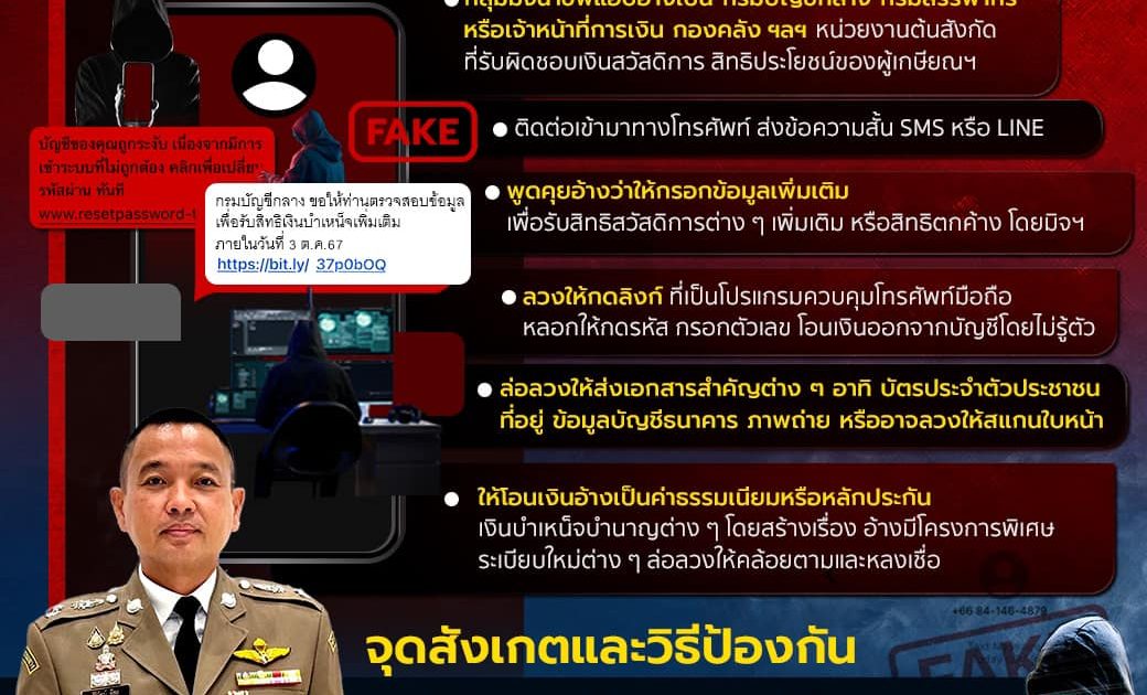 สำนักงานตำรวจแห่งชาติ จึงขอประชาสัมพันธ์ให้ผู้เกษียณอายุราชการและบุคคลในครอบครัว เพิ่มความระมัดระวังกลุ่มมิจฉาชีพที่อาจแอบอ้างเป็นหน่วยงานราชการที่เกี่ยวข้องกับเงินสิทธิประโยชน์ และสวัสดิการต่าง ๆ เช่น กรมบัญชีกลาง กรมสรรพากร หรือหน่วยงานต้นสังกัดที่รับผิดชอบเงินสวัสดิการของผู้เกษียณอายุราชการ ติดต่อมาเพื่อหลอกลวงให้ส่งข้อมูลส่วนบุคคล ข้อมูลบัญชีธนาคาร และเอกสารสำคัญต่าง ๆ รวมถึงการหลอกให้กดลิงก์ หรือหลอกลวงให้โอนเงินเพื่อเป็นหลักประกันในการรับเงินบำเหน็จบำนาญและเงินตอบแทนต่าง ๆ