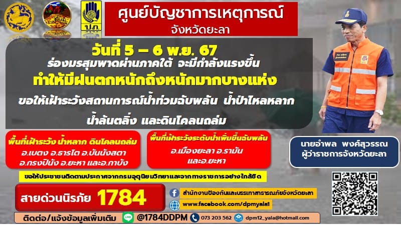 เฝ้าระวังอาจมีฝนตกหนักถึงหนักมากในบางแห่ง 4 พฤศจิกายน 2567 โดย admin / ข่าวประชาสัมพันธ์ วันที่ 5 - 6 พฤศจิกายน 2567 จังหวัดยะลา เฝ้าระวังอาจมีฝนตกหนักถึงหนักมากในบางแห่ง ขอให้ระวังสถานการณ์น้ำท่วมฉับพลัน น้ำป่าไหลหลาก น้ำล้นตลิ่งและดินโคลนถล่ม #ด้วยความห่วงใย ____________________ ตำรวจภูธรจังหวัดยะลา FacebookFacebookXXLINELine