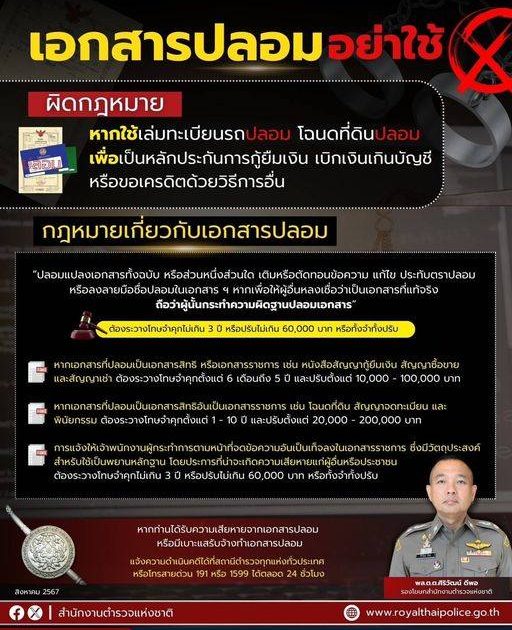 เมื่อวันที่ 21 สิงหาคม 2567 พล.ต.ต.ศิริวัฒน์ ดีพอ รองโฆษกสำนักงานตำรวจแห่งชาติ กล่าวว่า ปัจจุบันพบว่ามีประชาชนนำใบคู่มือจดทะเบียนรถปลอม (เล่มทะเบียนรถปลอม) หรือโฉนดที่ดินปลอม มาใช้เป็นหลักประกันการให้กู้ยืมเงิน เบิกเงินเกินบัญชี หรือขอเครดิตด้วยวิธีการอื่น เป็นจำนวนมากซึ่งการกระทำดังกล่าวเป็นความผิดและมีโทษตามประมวลกฎหมายอาญา มีโทษจำคุกสูงสุด 10 ปี ปรับสูงสุด 200,000 บาท