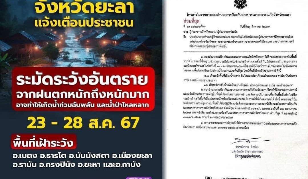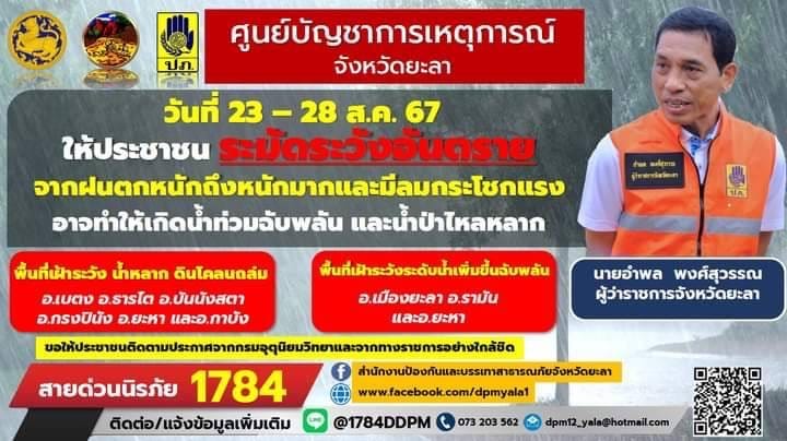 แจ้งเฝ้าระวัง ฝนตกหนัก!! 23 สิงหาคม 2567 โดย admin / ข่าวประชาสัมพันธ์ แจ้งเฝ้าระวัง ฝนตกหนักครับ ห้วงวันที่ 23 - 28 สิงหาคม 2567 ให้ประชาชนในพื้นที่จังหวัดยะลา ระมัดระวังอันตราย จากฝนตกหนักถึงหนักมากและมีลมกระโชกแรง อาจทำให้เกิดน้ำท่วมฉับพลัน และน้ำป่าไหลหลาก #ด้วยความห่วงใย ____________________ ตำรวจภูธรจังหวัดยะลา FacebookFacebookXXLINELine