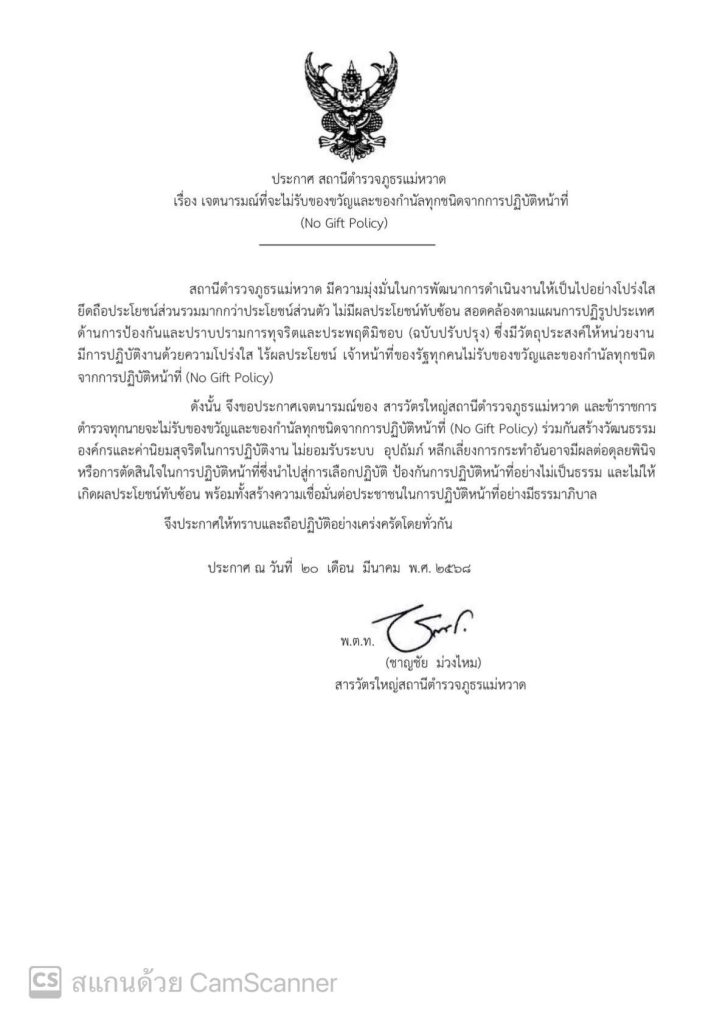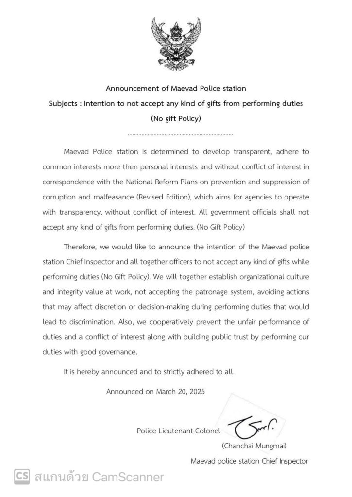 (No Gift Policy) 20 มีนาคม 2568 โดย admin / ข่าวประชาสัมพันธ์,ข่าวกิจกรรม,ข่าวประชาสัมพันธ์,ข่าวภารกิจผู้บังคับบัญชา,ผลการปฏิบัติ,อำนวยการ,มีนาคม งาน อก. สถานีตำรวจภูธรแม่หวาด มีความมุ่งมั่นในการพัฒนาการดำเนินงานให้เป็นไปอย่างโปร่งใส ยึดถือประโยชน์ส่วนรวมมากกว่าประโยชน์ส่วนตัว ไม่มีผลประโยชน์ทับซ้อน สอดคล้อง ตามแผนการปฏิรูปประเทศด้านการป้องกันและปราบปรามการทุจริตและประพฤติมิชอบ ซึ่งมีวัตถุประะสงค์ให้หน่วยงาน มีการปฏิบัติงานด้วยความโปร่งใส ไร้ผลประโยชน์ เจ้าหน้าที่ของรัฐทุกคนไม่รับของขวัญและของกำนัลทุกชนิดจากการปฏิบัติหน้าที่ (No Gift Policy) FacebookFacebookXXLINELine